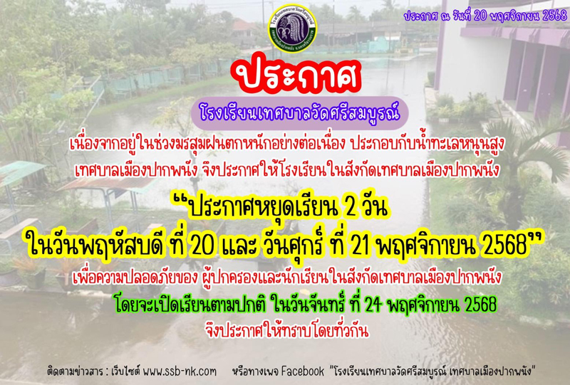 เนื่องจากฝนตกหนักอย่างต่อเนื่อง ประกอบกับน้ำทะลหนุนสูง เทศบาลเมืองปากพนัง จึงประกาศปิดโรงเรียนในสังกัดฯ เป็นเวลา 2 วัน โดยทำการเปิดเรียนตามปกติในวันจันทร์ที่ 24 พฤศจิกายน 2568 .