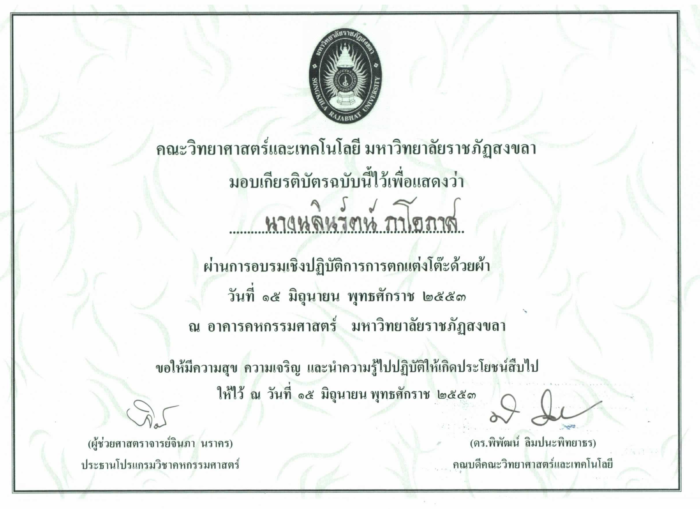 เกียรติบัตรผ่านการอบรมเชิงปฎิบัติการการตกแต่งโต๊ะด้วยผ้า วันที่ 15 มิ.ย. 2553 ณ อาคารคหกรรมศาสตร์ มหาวิทยาลัยราชภัฎสงขลา